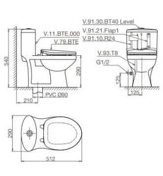 Bàn cầu một khối BTE có kích thước nhỏ gọn chỉ D550* R285 * C540, phù hợp cho mọi diện tích và yêu cầu sử dụng.